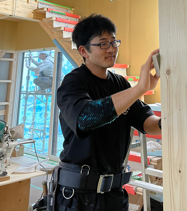 小学校低学年のときにテレビのリフォーム番組を見て、「匠(たくみ)」と呼ばれる建築士がかっこいいと思ったという宮下氏。家づくりに興味を持ち、そのうち匠の理想の設計を現実の形にする大工職人のほうがすごい、そんな人になりたいと将来の夢を描いた。 高校卒業後は迷わず、大工を養成する札幌高等技術専門学院建築技術課に入学。いよいよ技術が身につけられると、「すべてが新鮮で充実していた」と話す。同じ夢を持つ仲間と競い合うことも喜びだった。 授業の一環に工務店の仕事を体験する社会見学があり、そこで丸三ホクシン建設の現場とモデルハウスを訪問。手刻みで、木をふんだんに使っている。「こんな家を作りたい」と、宮下氏は就職先に選んだ。 入社当初から指導は同社工事部課長の渡辺祐樹氏が行った。大工歴30年以上のベテランだ。現場はプレカットが多かったが、3年目を迎えた今年、宮下氏は初めて念願の手刻みの住宅を手掛けた。 外部の造作はあと3週間程で完成の予定。ここからは宮下氏が一人で施工するそうだ。「本人がやりたいと言ったから」と渡辺氏は笑う。もちろん目は光らせるが、「3年目で任せられるのは早いほう」と言い添える。また、宮下氏は、(一社)北海道ビルダーズ協会によるポリテクセンター北海道の新人大工育成プログラムの研修を受け、3年目を迎える。他の会社の若手大工と一緒に学べ、励みになったと話す。 能登半島地震の被害地域に応急仮設住宅を建設するための大工派遣にも参加し、貴重な経験を積んだ。 「ものを作る楽しさの中で、一番大きなものを大工が作っている」と心に留め、どんな時も「なりたかった大工になれたから楽しくやってこられた」とうなずく。