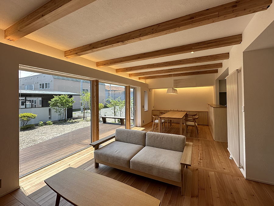 須貝氏は地産地消の家づくりをテーマにしている。小松建設は道産カラマツのフローリングとほたて漆喰の内装を特徴とする「コマツスタイル」で、地域の気候風土に合った住宅を作ってきた。方向性が同じだったことが、今回のコラボレーションを実現させた。